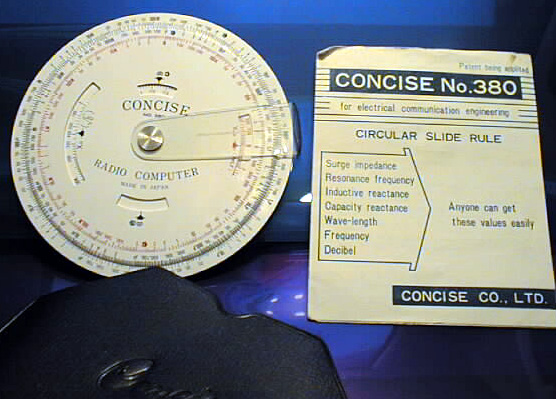 Concise 380 Electrical Engineering Circular Slide Rule Calculates Surge Impedance, Resonant Frequency, Inductive and Capacitive Reactance, Wave-length, Frequency, and Decibel ratios. Complete with case and manual. Somewhat rare. $350.